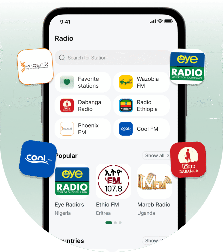 Listen to your favourite radio stations from across Africa and stay connected to home wherever you are.